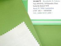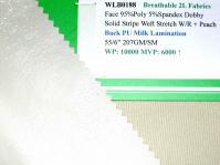 Lamination Coating-Bonded See Larger Image WLB0188 Face 95%Poly 5%Spandex Solid Dobby Stripe Weft Stretch W/R+Peach Back PU Milk Lamination WP:10000 MVP:6000 See Larger Image WLB0175 86%Poly 14%Spandex Solid W/R Back Film Lamination 55/6" 166GM/SM WP:10000 MVP:6000 See Larger Image WLB0162 Face Nylon Benglin Solid W/R Back Breathable Film Printing Coating 56" 118GM/SM WP:5000 MVP:5000 See Larger Image WLB0050 Face Poly Knit + W/R Back TPU Breathable Film WP:3000 MVP:3000 See Larger Image WLB0051 Face Nylon Taslon Pera Coated + W/R Back Poly Single Fleece 53/4" 295GM/SM See Larger Image WLB0041 Face Poly Dobby T900D Back PVC Coating 58" 295GM/SM See Larger Image WLB0032 100%Nylon Solid Dobby PU2 N800D 58" 355GM/SM See Larger Image WLB0027 94%Nylon 6%Poly Dobby PU2 N800DxT1000D 58" 355GM/SM See Larger Image WLB0025 100%Nylon Solid + PU2 N800D 58" 355GM/SM See Larger Image WLB0022 100% Nylon Dobby Solid PU2 58" 355GM/SM See Larger Image WLB0059 Face Poly Suede W/R Back Breathable Film Coated 57/8" 220GM/SM See Larger Image MW2243 Face Poly Mesh Back TPU Lamination 0.27MM 90GM/SM See Larger Image MW2231 Nylon Oxford + TPU Lamination 0.27 + - 3MM